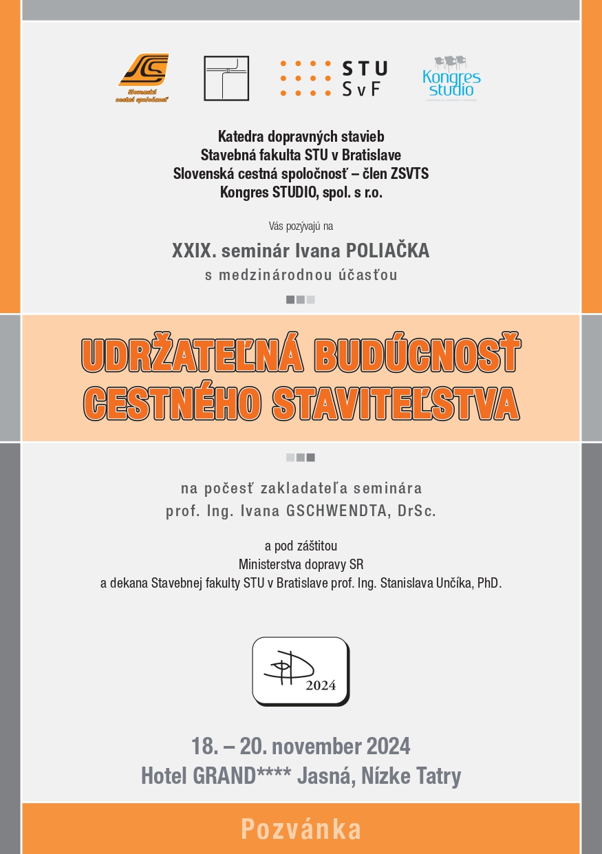 V dňoch 14. - 16.11.2022 sa uskutočnil už 27. ročník tradičného podujatia Seminár Ivana Poliačka, ktorý organizuje Katedra dopravných stavieb Stavebnej fakulty STU v Bratislave spoločne so Slovenskou cestnou spoločnosťou a hlavným organizačným garantom Kongres STUDIO, spol. s r.o.. Po dlhšej dobe sme sa v počte takmer 130 účastníkov stretli osobne v prostredí hotela Grand Jasná v Nízkych Tatrách a aj v online priestore. Záštitu nad seminárom na počesť významného pedagóga a odborníka v cestnom staviteľstve, aj popredného funkcionára Slovenskej cestnej spoločnosti prevzalo Ministerstvo dopravy a výstavby SR a dekan Stavebnej fakulty STU v Bratislave prof. Ing. Stanislava Unčík, PhD.