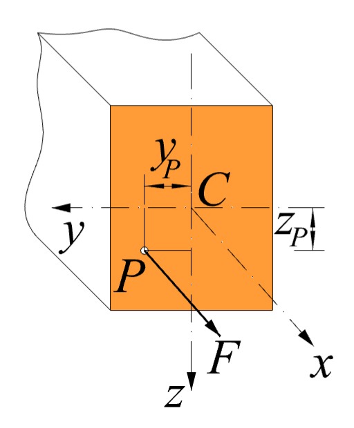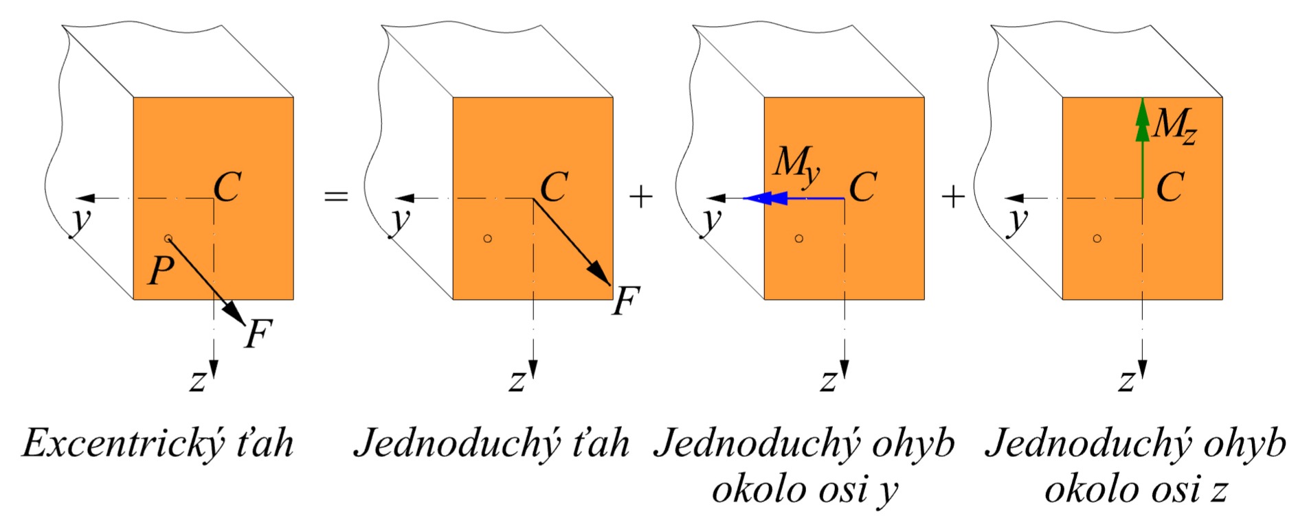 Ak normálovú silu posunieme do ťažiska prierezu, okrem vzniku normálovej sily, dochádza aj ku vzniku ohybových momentov, ktoré pôsobia v centrálnych hlavných osiach zotrvačnosti prierezu. Smer normálovej sily ovplyvňuje či v danom bode prierezu budú vlákna tlačené alebo ťahané. Pri riešení stavu napätosti pri tomto spôsobe namáhania použijeme princíp superpozície.