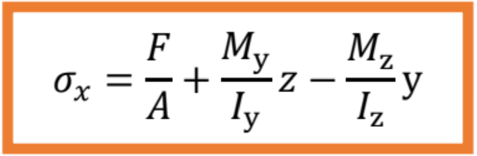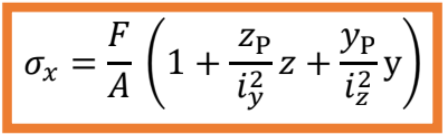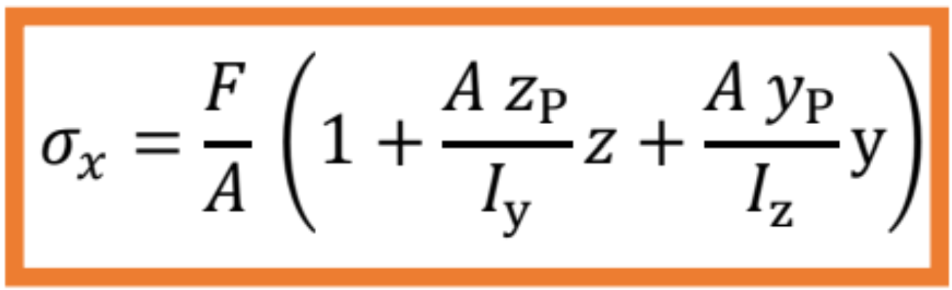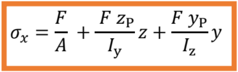 Po dosadení vzťahov na výpočet momentov dostaneme výsledné normálové napätie, ak v priereze pôsobí sila a ohybové momenty: