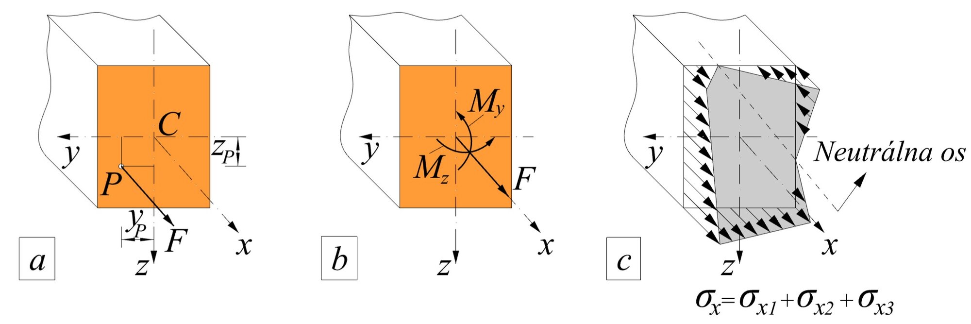 Ak už bolo uvedené, ak posunieme excentrickú silu F do ťažiska prierezu, potom jej účinok k jednotlivým hlavným osiam zotrvačnosti môžeme určiť nasledovne: