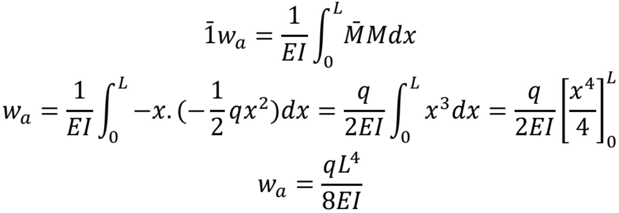 Uvažujme konzolu zaťaženú rovnomerným spojitým zaťažením, s konštantnou ohybovou tuhosťou El. Určte zvislý priehyb bodu a konca konzoly, wa = ?.