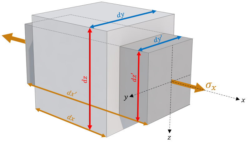 - Diferenciálny hranolček bude zaťažený v smere x napätím σx.