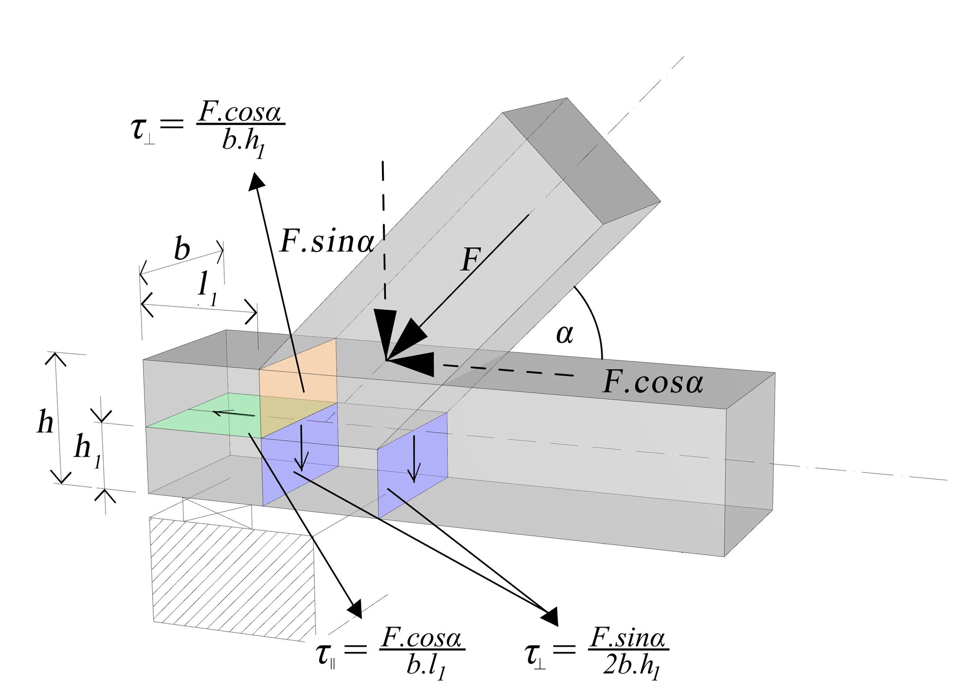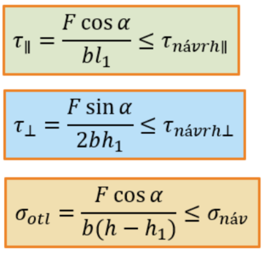 - Tak ako pri niektorých konštrukčných detailoch a spojoch aj pri drevených spojoch môžeme zjednodušene uvažovať s plochami namáhanými jednoduchým šmykom. Návrh rozmerov šmykovej plochy vyplýva z podmienky neprekročenia šmykového napätia určeného normou. Napr. pri čapovom spoji krokvy a trámu strešnej konštrukcie pri posúdení rozmerov l1 a h1 musia byť splnené podmienky: