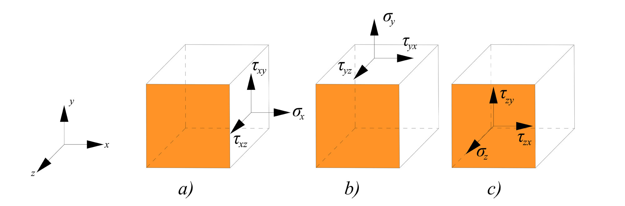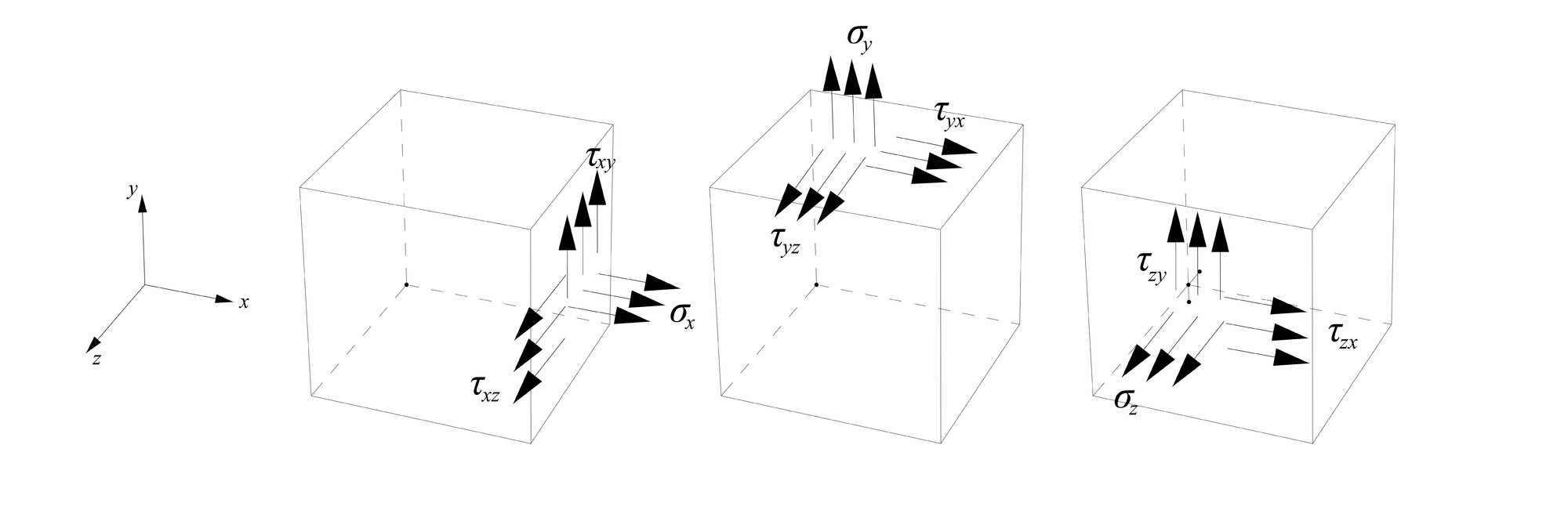 Stredom kocky vedieme rez v rovine yz a označíme si napätia od jednotlivých zložiek sily F. Rovina yz má normálu v smere osi x. Od sily Fx vzniká na ploche rezu normálové napätie σx, od Fy vzniká šmykové napätie τxy a od Fz vzniká šmykové napätie τxz. Normálové napätia označujeme indexom podľa normály plochy, na ktorej vznikajú.
