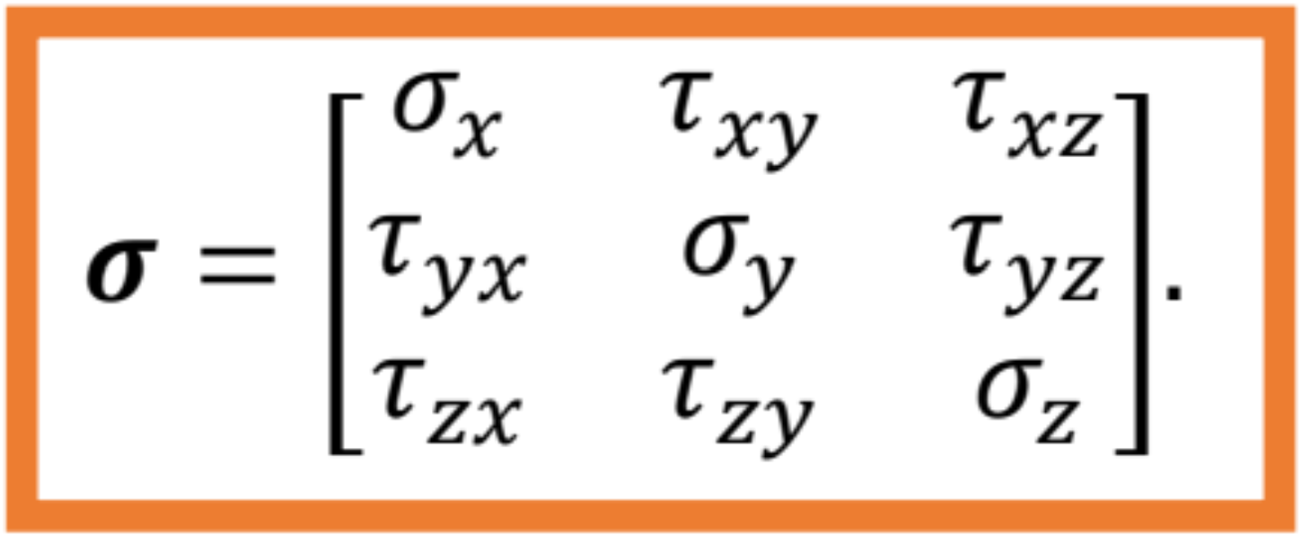 Stav napätosti v bode B úplne popisuje uvedených deväť zložiek napätia, ktoré pôsobia v troch kolmých rovinách. Tieto zložky napätia môžeme zoradiť do jedného matematického objektu, takzvaného tenzora napätosti. Matematicky ho zapíšeme ako maticu