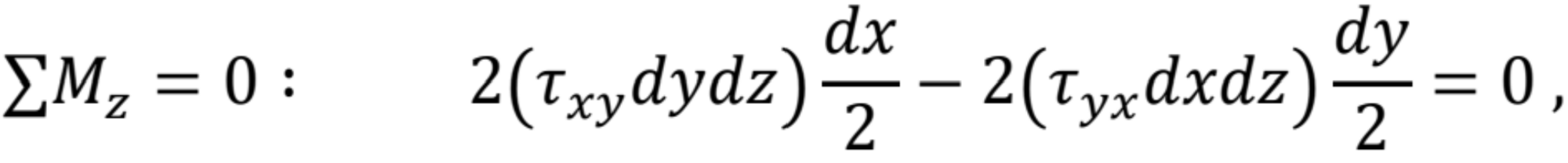 Zameriame sa na šmykové napätia pôsobiace v rovine xy, a to τxy a τyx. Ak uvažujeme, že je bod B v pokoji, potom musí byť ľubovoľná silová či momentová podmienka na diferenciálnom elemente rovná nule. Zapíšeme momentovú podmienku okolo osi z