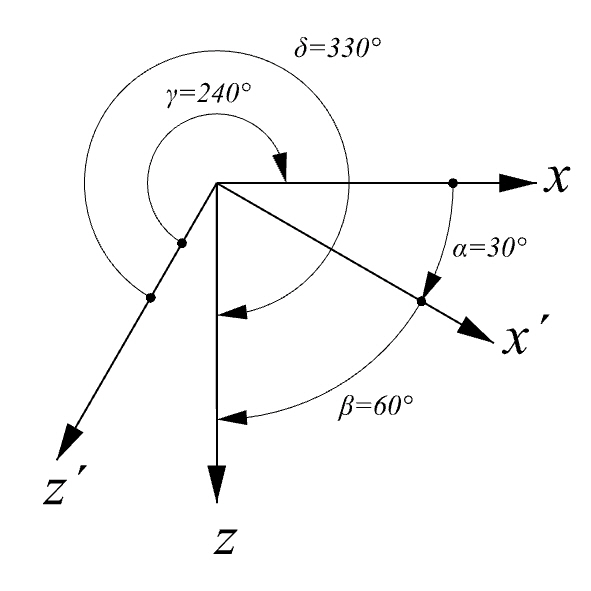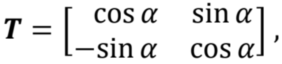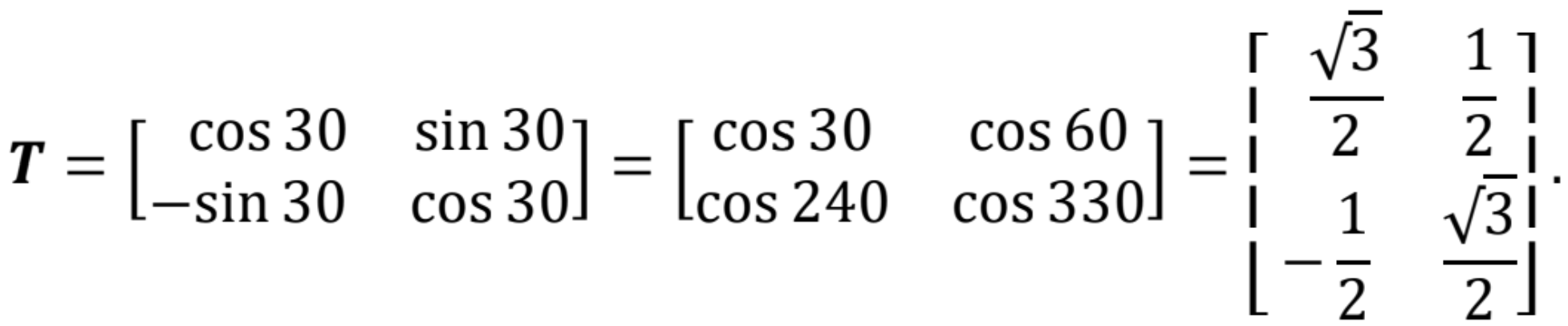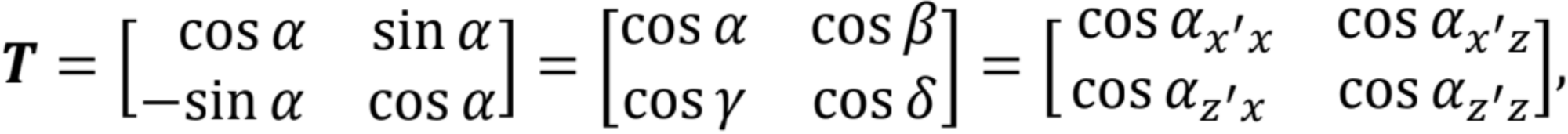 Transformačnú maticu pre rovinný stav napätosti môžeme vyjadriť na základe uhlov, ktoré vzájomne zvierajú osi pôvodnej a pootočenej sústavy súradníc. Prvky transformačnej matice sú smerové kosínusy orientovaných uhlov, ktoré jednotlivé osi zvierajú. Smerový kosínus uhla, ktorý zviera os x’ s osou x zapíšeme ako cos αx'x .