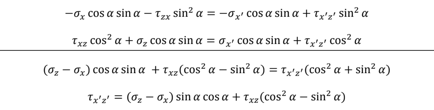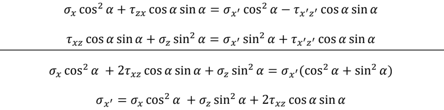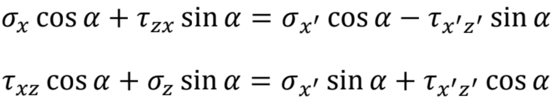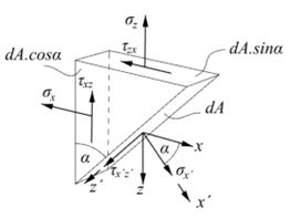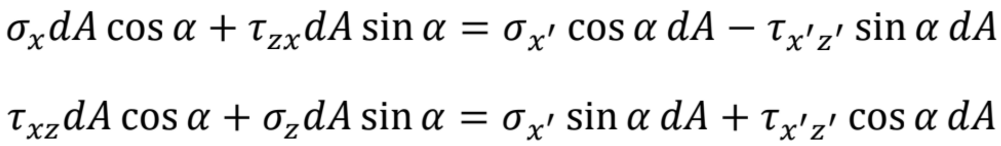 Na rovnovážny diferenciálny element pôsobia napätia v rovine vo vodorovnom a zvislom smere. Diagonálny rez definuje pootočenú sústavu súradníc x’z’, v ktorej pôsobí normálové napätie σx' a šmykové napätie τx'z'. Diagonálny rez má plochu dA. Všetky napätia na skosenom diferenciálnom elemente musia byť v rovnováhe. Zapíšeme rovnováhu síl v smere x a z