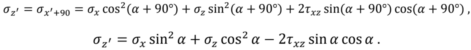 Pre úplné opísanie stavu napätosti v pootočenej sústave súradníc potrebujeme normálové napätia σz' v smere z’. Namiesto odvodenia na diferenciálnom elemente ich nájdeme ako normálové napätia na ploche pootočenej o α + 90°