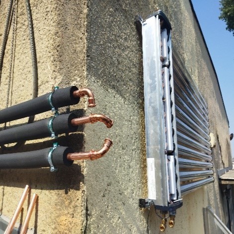 Vybavenie laboratória: Pre laboratórium bol navrhnutý plochý doskový kolektor VITOSOL 100-FM a vákuový trubicový kolektor VITOSOL 300-TM. Kolektory sú prepojené meďou (CU potrubím DN 20-iz) do existujúceho zásobníka teplej vody Dražice OKCE 250 S s objemom 250 litrov (Obr. 4 pol. 1). Spojenie je zabezpečené cez armatúry, výmenník a čerpadlovú jednotku. Potrubia sú vedené od kolektorov po streche nad vstupom do objektu (medzi halou a administratívnou časťou), v zadnej časti klesajú a vstupujú do budovy, do časti so sanitárnymi zariadeniami (umývadlá, sprchy). Potrubia sú pripojené k existujúcemu zásobníku teplej vody, ktorý zabezpečuje ohrev pitnej vody. Rozvody teplej a studenej vody od zásobníka k zariadeniam zostali nezmenené. Pre reguláciu teploty vody bol nainštalovaný termostatický zmiešavací ventil R3/4 so šróbením, ktorý umožňuje centrálne nastavovanie a obmedzenie maximálnej teploty teplej vody (35–65°C).