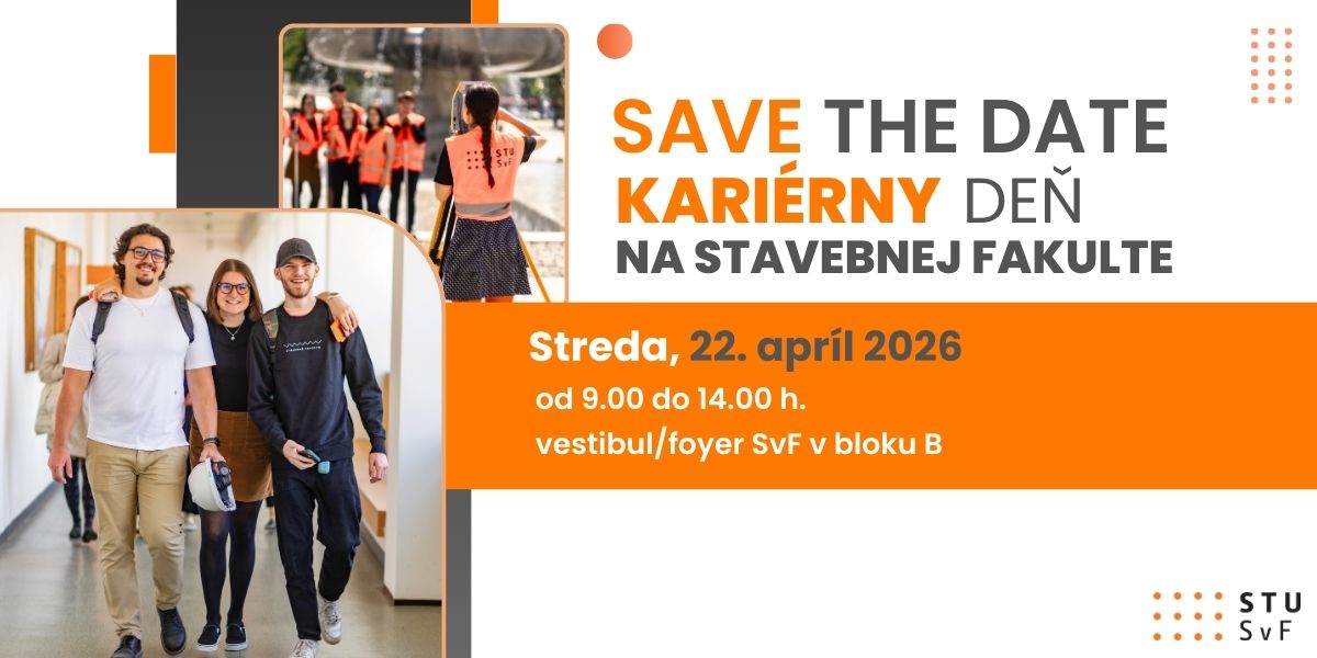 dovoľujeme si Vás srdečne pozvať na Kariérny deň Stavebnej fakulty STU v Bratislave, ktorý sa bude konať v stredu 22. apríla 2026 na pôde Stavebnej fakulty v čase od 09.00 h. do 14.00 h.